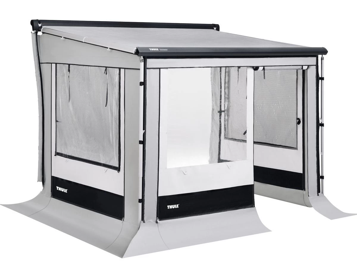 De Thule Residence G3 5102 is een solide zijwandenset met een bijhorende voorwand. Door middel van de meegeleverde aluminium klemprofielen, zowel aan de achterkant als boven het doek langs, is de tent geheel af te sluiten tegen wind en water. De ruimte tussen de wanden van het voertuig en de zijwanden worden afgedicht met een verstelbaar mastprofiel met dubbele rubberflappen. Een diagonale steun tussen het de aluminium profielen zorgt voor perfecte stabiliteit.